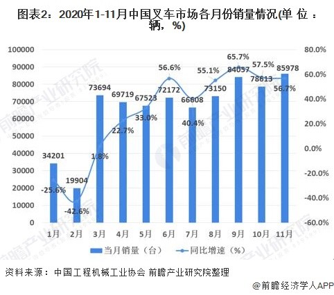 2020年受益于国内新冠疫情得到迅速控制,国内制造业、物流业的快速恢复,叉车市场需求快速增长。2020年1-11月份的累计销量达到72.56万辆,与2019年同期相比增长30.3%。