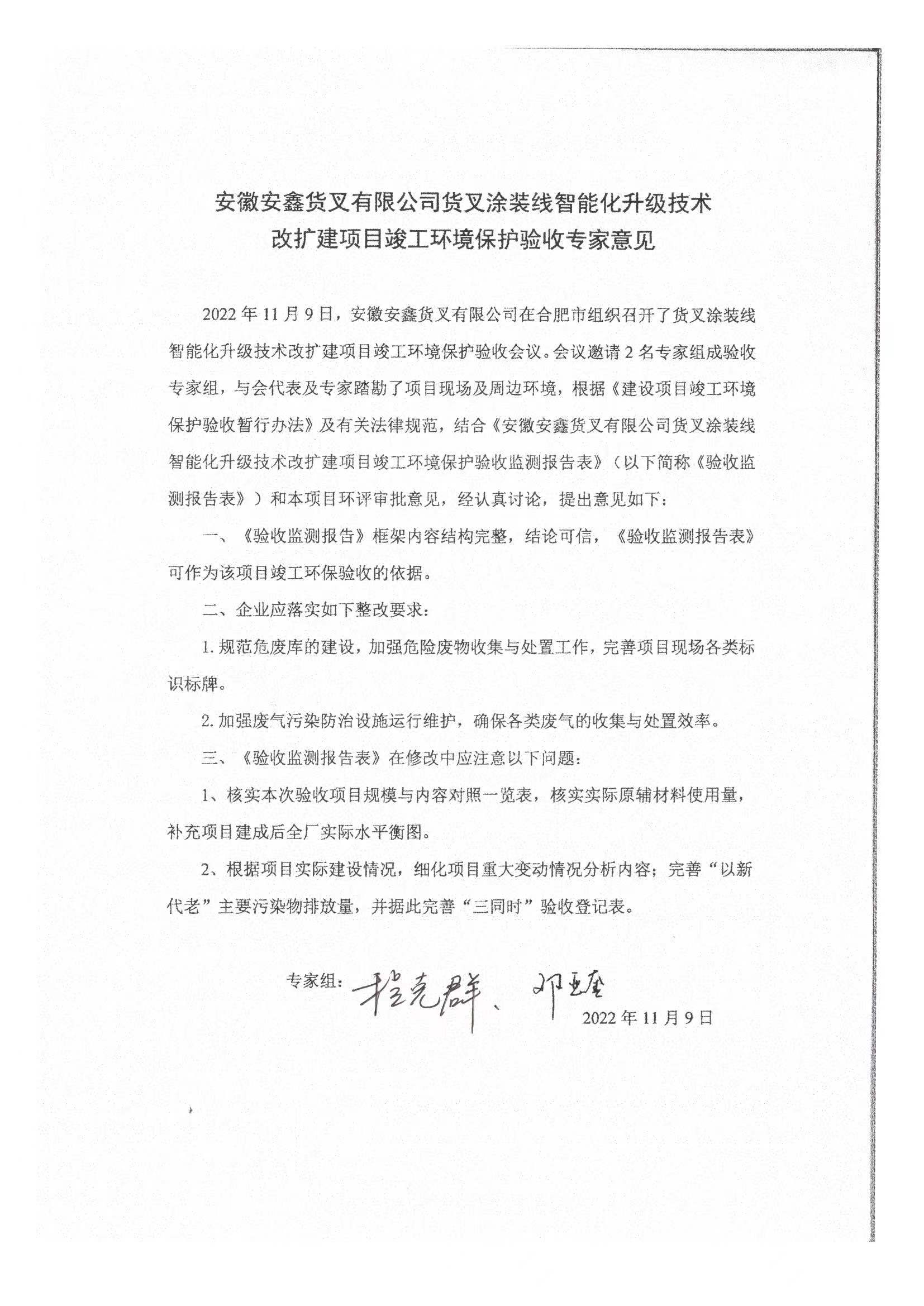 1、安徽安鑫货叉有限公司货叉涂装线智能化升级技术改扩建项目竣工环境保护验收调查报告及验收意见